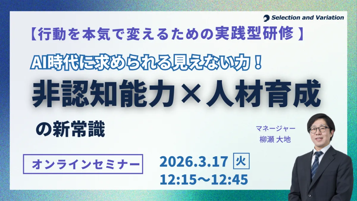 セレクションアンドバリエーション株式会社が2026年3月17日に開催するセミナーでは、AI時代に求められる「非認知能力」の重要性が紹介されます。現代の企業環境において、知識やスキルなどが数値で測定可能な「認知能力」が注目されがちですが、近年、非認知能力、つまり自己理解や共感力、粘り強さ、主体性といった“見えない力”がこれまで以上に重要とされています。これらはAIには持ち得ない人間特有の能力であり、成功への鍵となるのです。