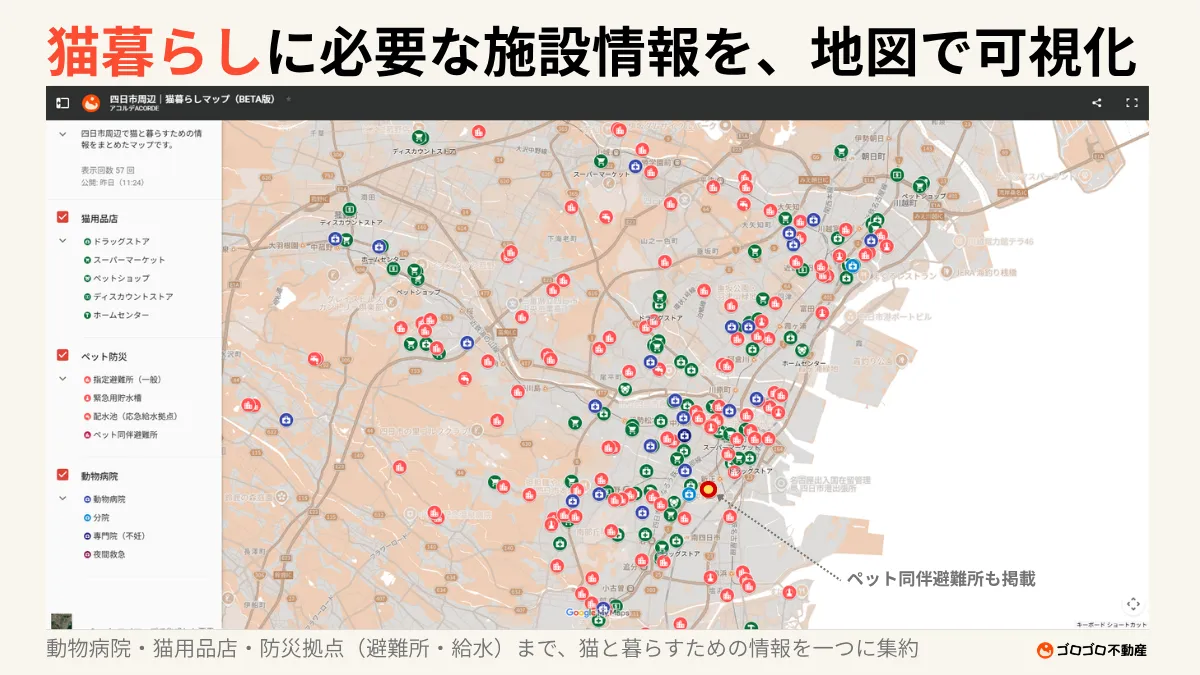 「猫暮らしマップ」は、四日市市およびその周辺地域の猫関連情報を簡単に見つけられるように設計されています。利用者は、動物病院や猫用品が購入できる店舗、さらには避難所や給水拠点といったペット防災情報を容易にアクセスできます。この試みは、特に新生活が始まる4月に向けて、住まい選びに役立つ情報を提供することを目的としています。