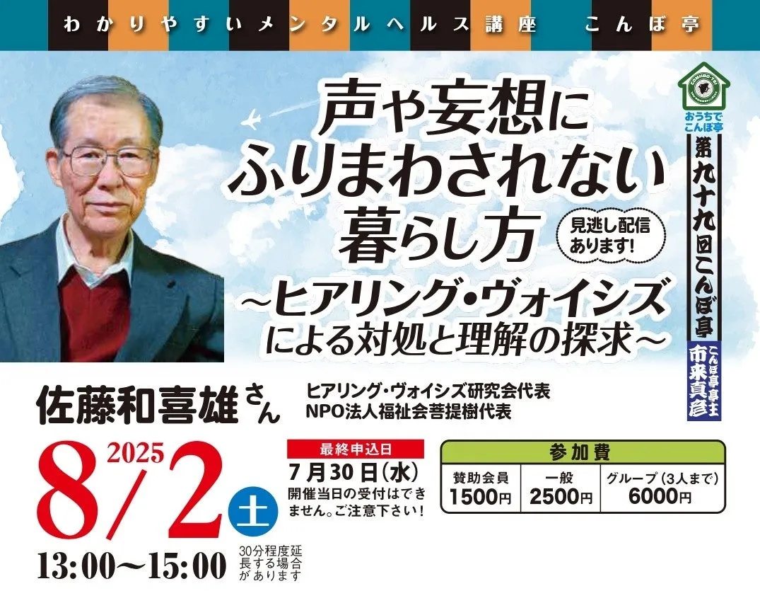2025年8月2日、特定非営利活動法人地域精神保健福祉機構(NPO法人コンボ)が主催する「第99回こんぼ亭月例会」がオンラインで開催されます。本イベントは「ヒアリング・ヴォイシズ」に焦点を当て、参加者が声や妄想に絡めた生き方を学ぶための貴重な場となります。