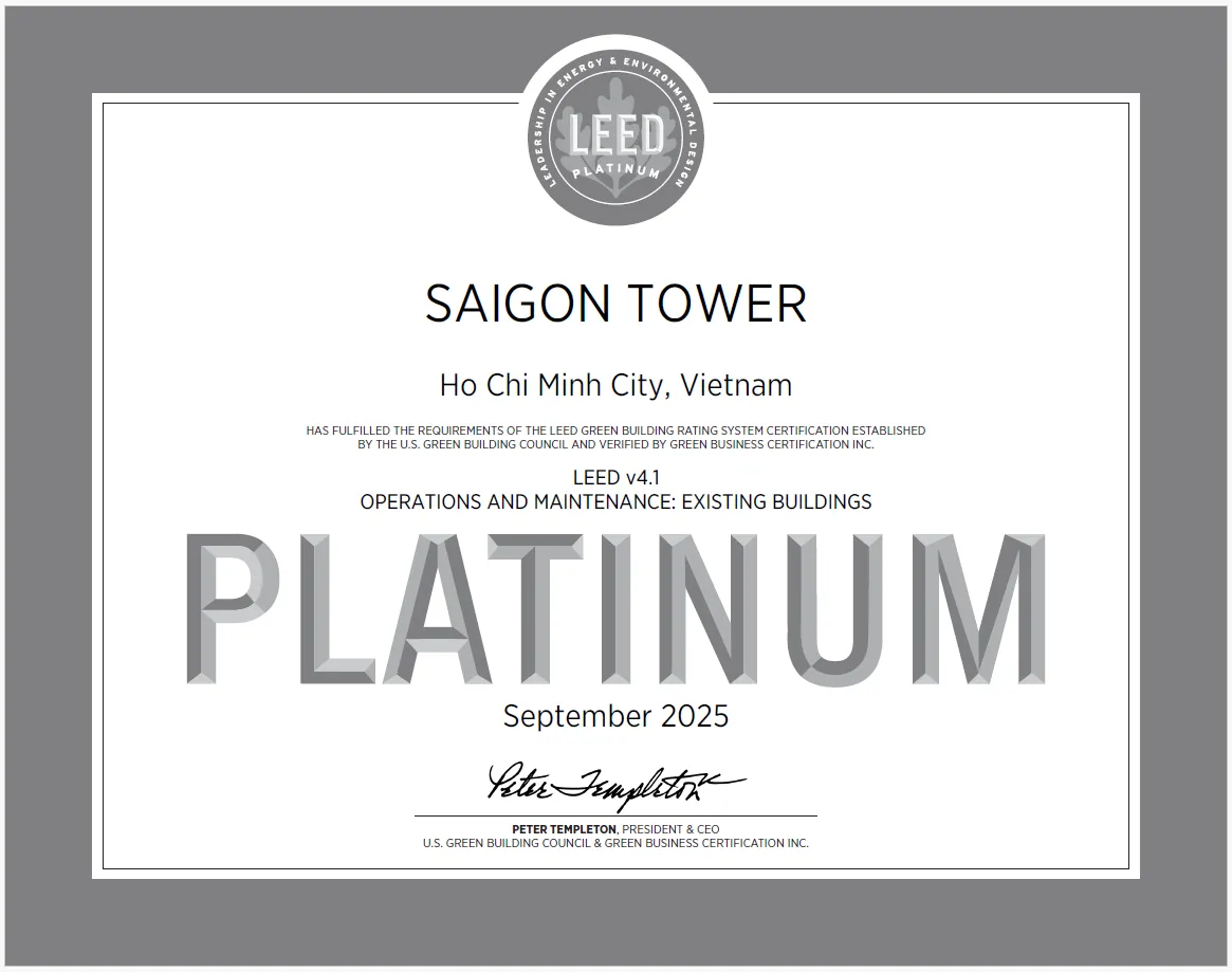 ダイビル株式会社(社長:丸山卓、本社:大阪市北区)のグループ会社、Daibiru Saigon Tower Co., Ltd.がホーチミン市にて運営する「サイゴン・タワー」が、2023年に環境認証「LEED Operations & Maintenance」の最高位である「Platinum」を取得しました。この認証は、米国のU.S. Green Building Councilが運営するもので、再生可能エネルギーの使用や廃棄物のリサイクル活動など、環境への配慮を評価したものです。