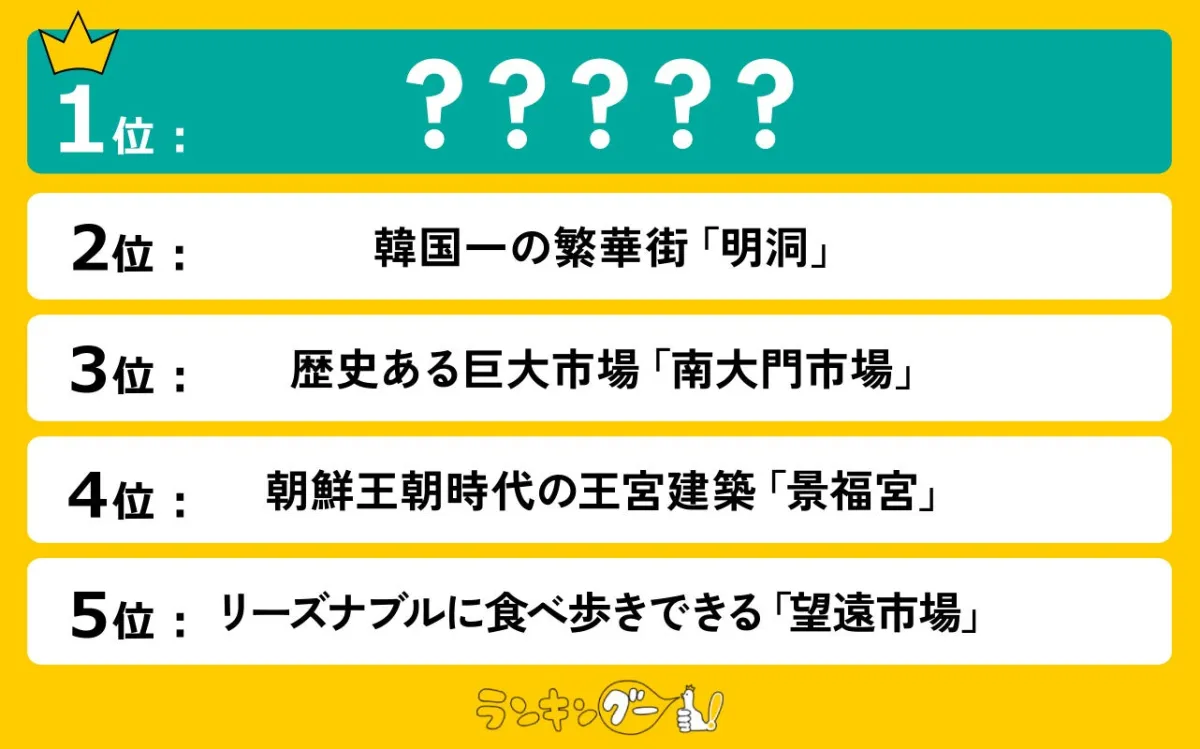 このランキングは、株式会社CMサイトが運営するランキングー!にて、女子旅に最適な韓国の名所を女性2,115名を対象にアンケートを行い、TOP10を決定しました。今回はその中から特に注目のTOP5をピックアップしてご紹介します。