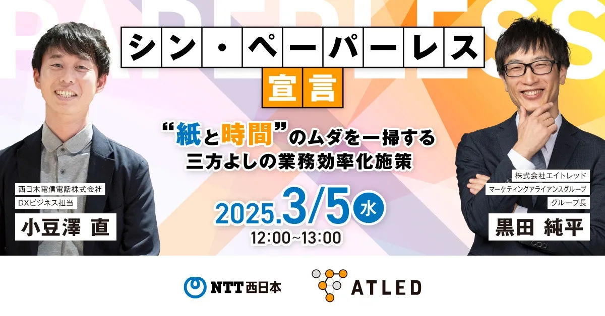 2024年3月5日、エイトレッドが西日本電信電話株式会社との共催で、オンラインセミナー『シン・ペーパーレス宣言』を実施します。本セミナーでは、無駄な紙や時間を省き、業務の効率化を図るための具体的な方法について深く掘り下げていきます。参加は無料で、事前に撮影された動画を視聴する形式で進行されるため、気軽に参加できます。