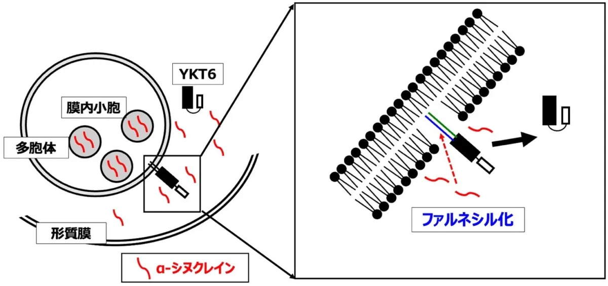 最新の研究では、α-シヌクレインがエクソソームの放出を抑制することが発見されました。具体的には、が増加することにより、可溶性N-エチルマレイミド感受性因子付着タンパク質であるYKT6が減少し、これがエクソソーム分泌の妨げとなることが示されています。YKT6は細胞膜との融合において重要な役割を果たし、その脂質修飾が影響を受けることで、エクソソームの放出が低下するという悪循環が生まりました。