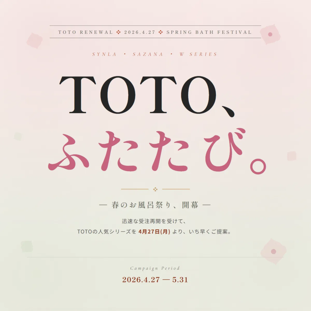 メガバックス株式会社は、TOTOのユニットバス及びシステムバスの受注が再開されることを受け、特別キャンペーン「TOTO、ふたたび。× 春のお風呂祭り」を2026年4月27日から開始します。このキャンペーンは、メガバックスが誇る正規施工会社としての信頼性に基づき、春の訪れに合わせて多くの家庭に新しいお風呂の体験を提案するものです。