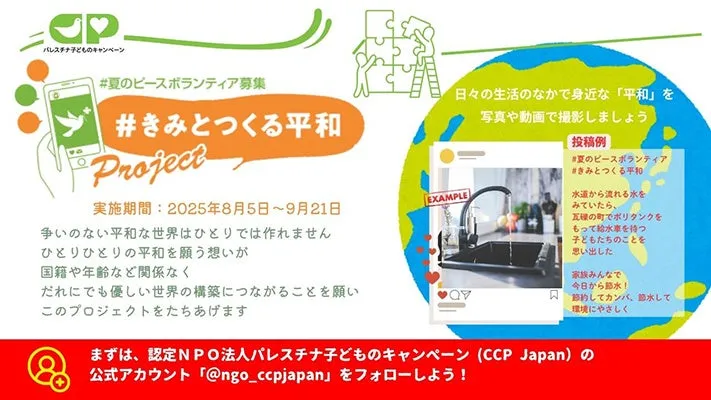 この夏、認定NPO法人CCP Japan(パレスチナ子どものキャンペーン)では、平和への関心を高めるために「#きみとつくる平和」というSNSキャンペーンを始めました。このキャンペーンの目的は、私たちの日常生活の中にある平和について考え、その想いを広めることです。