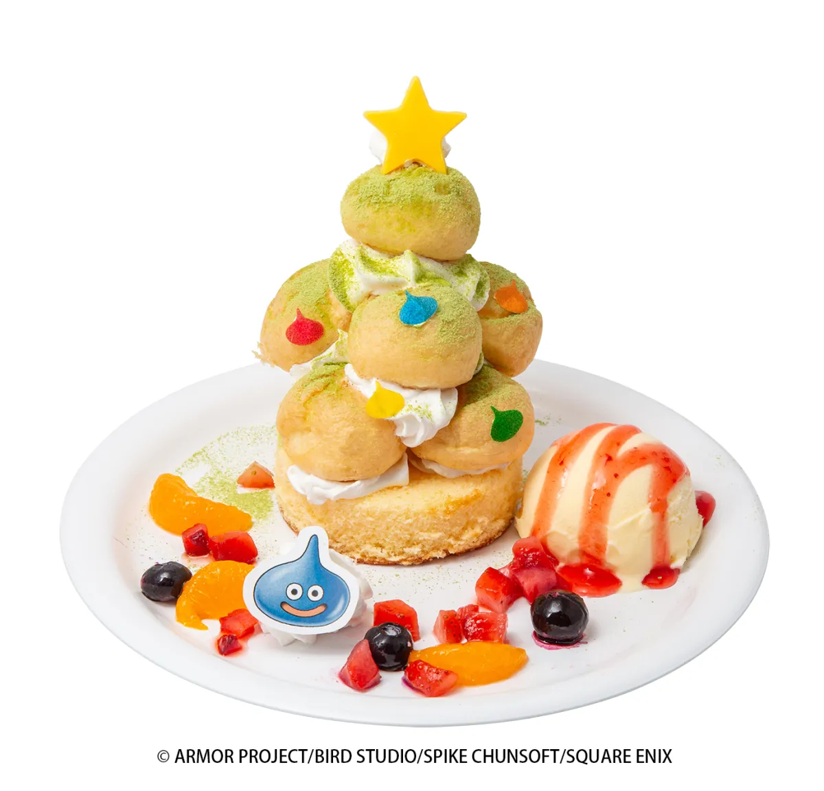 HD-2D版「ドラゴンクエストIII そして伝説へ…」の発売を祝い、限定メニューも登場します。例えば、「スライムのプロフィットロールツリー」や「いっかくうさぎのふわふわシナモンロール」、「バイキルミン」など、見た目も楽しめるスイーツとドリンクが揃っています。それぞれのメニューには限定のオリジナルコースターが付属します。
