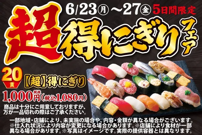 持ち帰り寿司店「小僧寿し」が、今年の6月23日(月)から27日(金)までの間、特別企画『超得にぎりフェア』を実施します。このイベントは、日頃の感謝の気持ちを込めた、とてもお得なチャンスです!