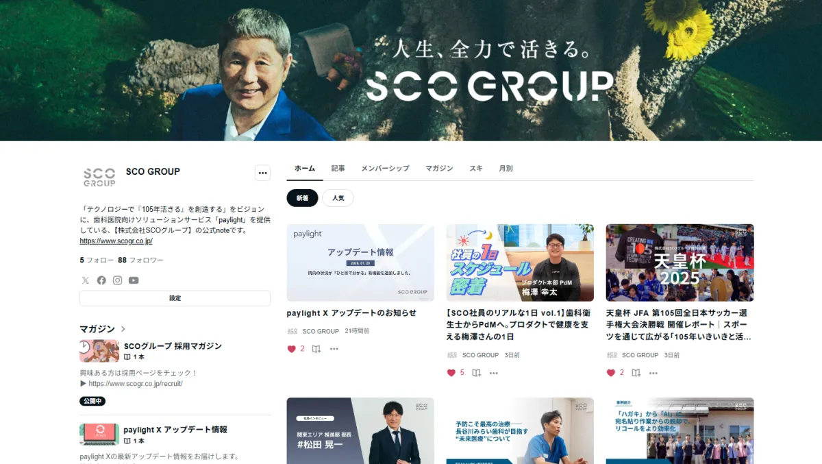 SCOグループは、歯科医院やパートナー企業といった多様なステークホルダーに対して、会社の価値観や事業への取り組みをより深く理解してもらうための情報発信をさらに強化していく方針です。また、将来的にSCOグループでのキャリアを考えている方々にも、社内文化や働く環境を具体的に感じてもらえるような情報提供を行ってまいります。今回の公式noteのリニューアルは、SCOグループと関わるすべての人々が、より深く、より正確に情報を得られる基盤を構築する初めの一歩と位置付けられています。