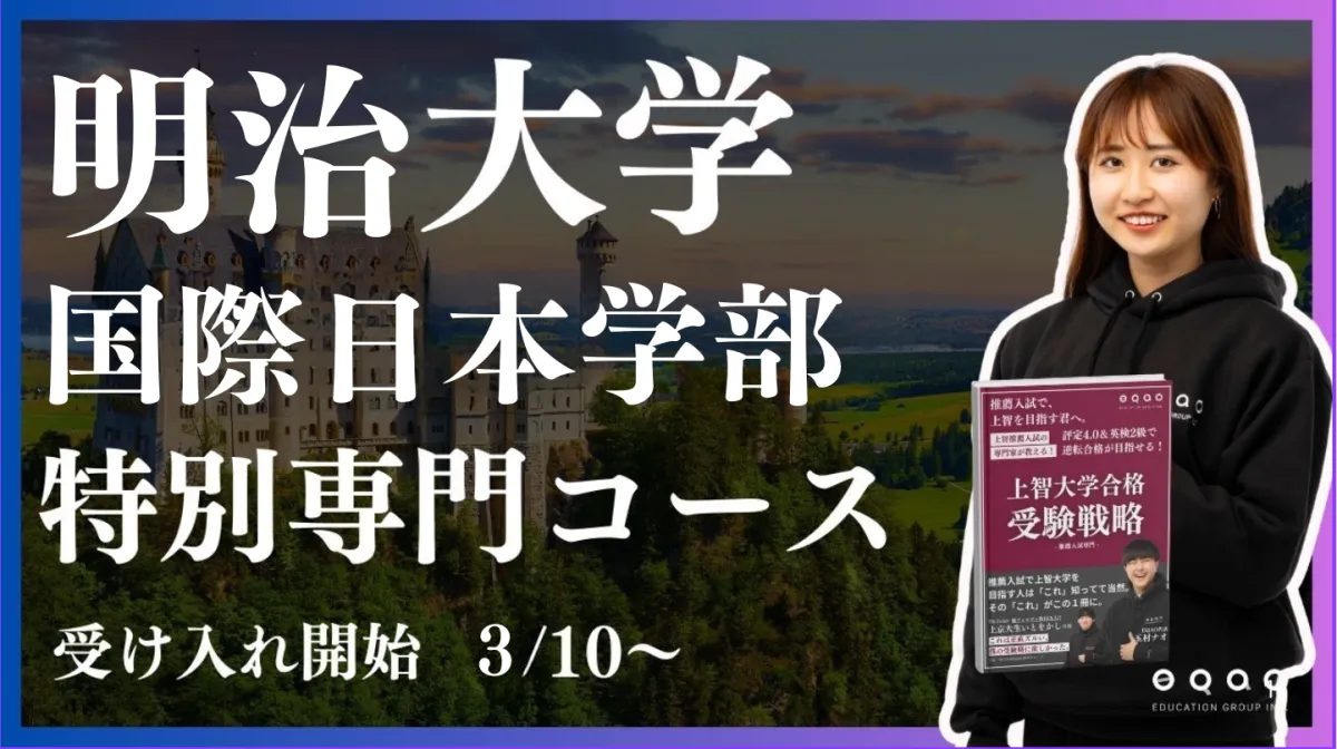 明治大学国際日本学部は、国際的視野を養う人材を育成するための特別専門コースを設けました。この取り組みにおいて、EQAO(株式会社EQAO教育グループ)は受験生を全面的にサポートするプログラムを開始しました。受験生にとって、質の高い情報と的確な指導が得られる貴重な機会です。
