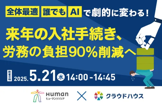 大手企業向けに開発された人事労務クラウドサービス『クラウドハウス労務』を運営する株式会社Techouseと、総合人材サービスを展開するヒューマンリソシア株式会社のコラボによる、オンラインセミナーが2025年5月21日(水)に開催されます。このセミナーの目的は、「全体最適」「誰でも」「AI」といった視点から、入社手続きや他の労務作業を効率化し、実際に負担を90%削減する方法を伝えることです。