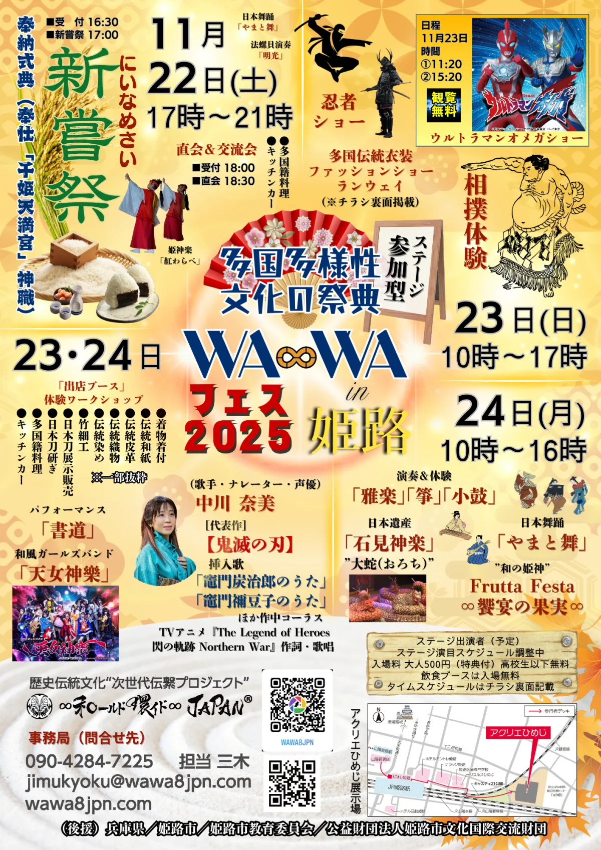 2025年11月、姫路市のアクリエひめじで、「WA∞WA FESTIVAL2025」が開催されます。国内外の多様な文化を一堂に体験できるこの祭典では、親子で楽しめる様々なアクティビティが用意されています。伝統芸能の体験コーナーや、アニメや特撮に関連したショー、さらには忍者体験、和楽器の演奏、書道パフォーマンス、多国籍のファッションショーなど、盛りだくさんのプログラムが目白押しです。