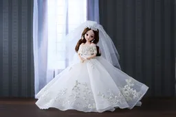 本商品は、ハツコ エンドウのアイコニックなウェディングドレス「マグノリア」を、リカちゃんサイズで忠実に再現しています。美しいドレスには、豪華な刺繍と繊細なレースがふんだんに施されており、まるで本物のウェディングドレスのような仕上がりです。 ややローウエストでボリューム感のあるスカートシルエットは、華やかさと洗練を兼ね備えたデザインとなっております。