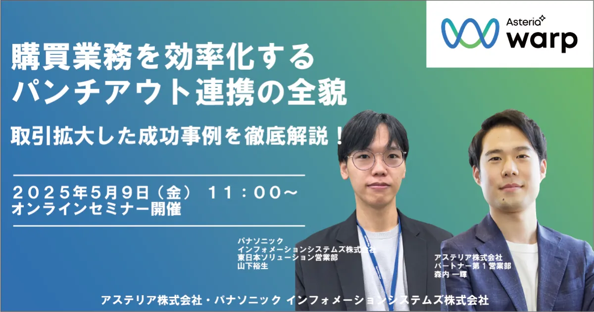 2025年5月9日(金)、オンラインで開催される「パンチアウト連携による購買業務を効率化セミナー」の詳細をお伝えします。このセミナーは、パナソニック インフォメーションシステムズ株式会社が主催し、アステリア株式会社が共催するもので、定員は50名と限られています。