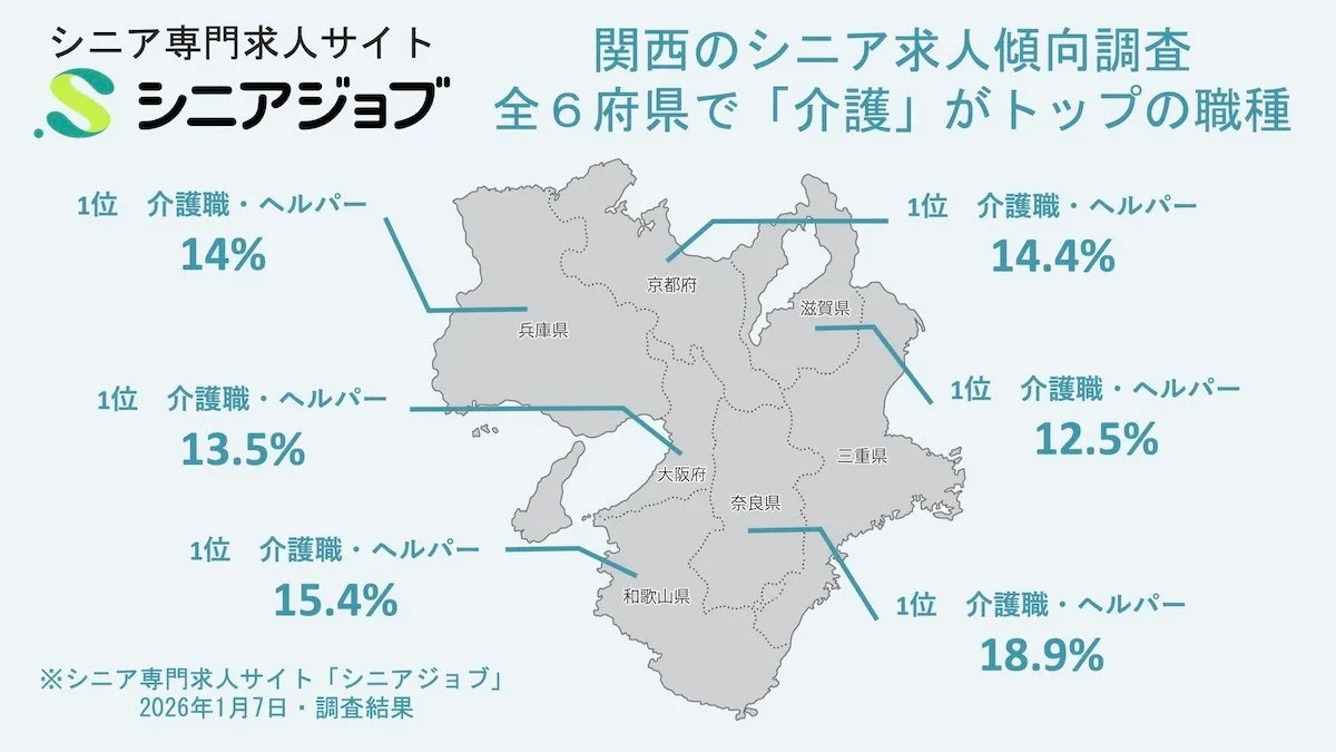 シニア転職サポートを行う株式会社シニアジョブ(本社:東京都新宿区、代表取締役:中島康恵)は、運営するシニア専門求人サイト「シニアジョブ」に掲載されている関西6府県(滋賀、京都、大阪、兵庫、奈良、和歌山)の求人データを元にした調査結果を発表しました。その結果、すべての府県で最も求人件数が多い職種が介護職であることが明らかになりました。