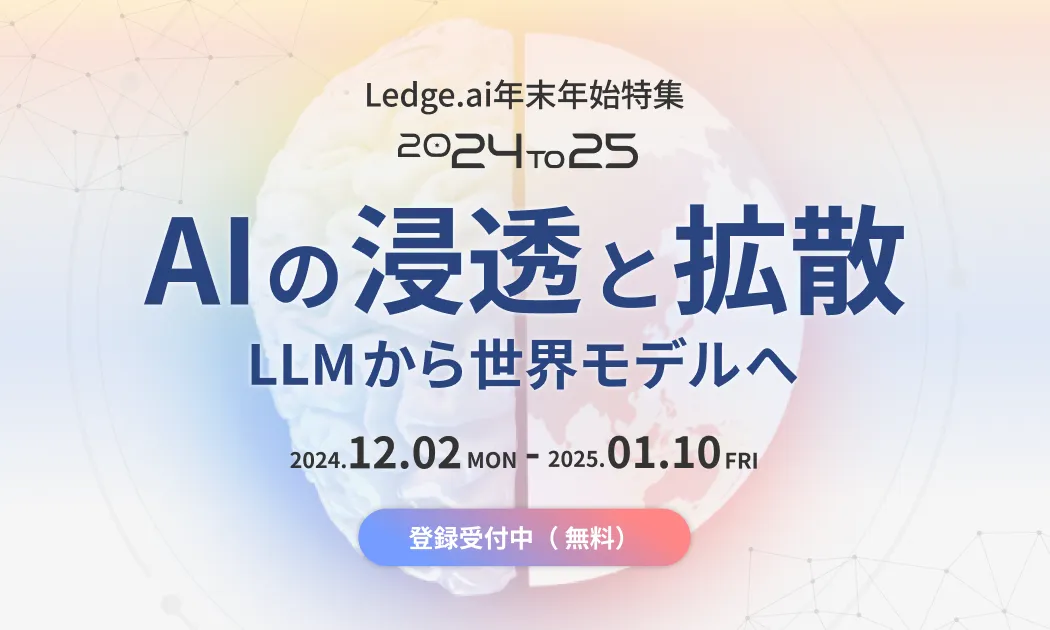 2024年のAI関連の動向と2025年以降のトレンドを網羅する特設サイト「Ledge.ai 24to25」が公開されました。本特集は、AIの進化を振り返りながら新年度に向けた情報を提供するものです。特に、AIの初心者から開発経験者まで幅広い層の方々に役立つ情報が盛りだくさんです。参加は無料で、ぜひこの機会にご覧いただきたいと思います。