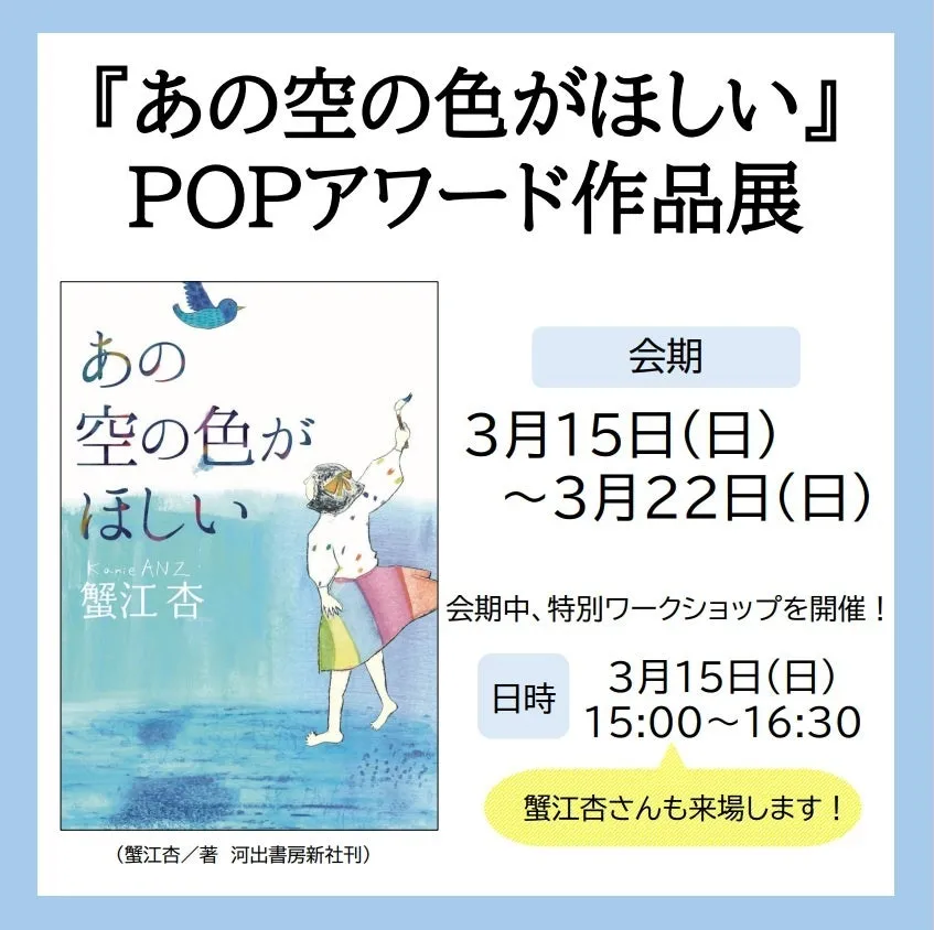 このアワードは、蟹江杏さんの作品『あの空の色がほしい』を題材にしたPOPアートを募集するものです。全国から集まった作品は全45点、審査を経て7作品が受賞となりました。授賞式は、2023年3月15日(日曜日)14時からイオンモール多摩平の森3階のイオンホールで行われます。