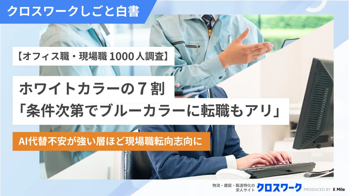 X Mile株式会社は、20代から60代のビジネスパーソン1,000名を対象に調査を行いました。被調査者は半数がオフィス職(ホワイトカラー)、残り半数が現場職(ブルーカラー)で、それぞれの働き方や将来の不安についての意見を集めました。