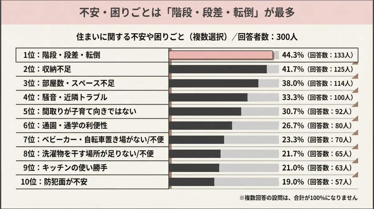 最も多くの回答が寄せられたのが不安や困りごとに関する項目です。ここで最も問題視されたのは、階段や段差による転倒リスクで、44.3%の人がこれを指摘しました。その他にも収納不足や騒音、部屋の広さ不足など、多岐にわたる不安が挙げられました。