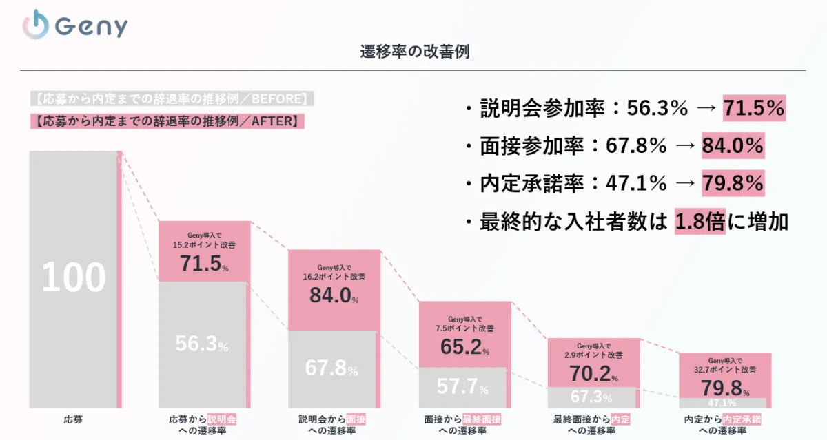 実際にGenyを導入した企業では、選考プロセスの各段階において飛躍的な改善が見られた。説明会の参加率は56.3%から71.5%に、面接参加率は67.8%から84.0%に、そして内定承諾率は47.1%から79.8%と、数値で見るとその効果は明白だ。また、多くの企業が採用工数を30〜40%削減することに成功し、削減したリソースを内定者フォローや広報施策に再投資することで、内定承諾率の向上にも寄与している。