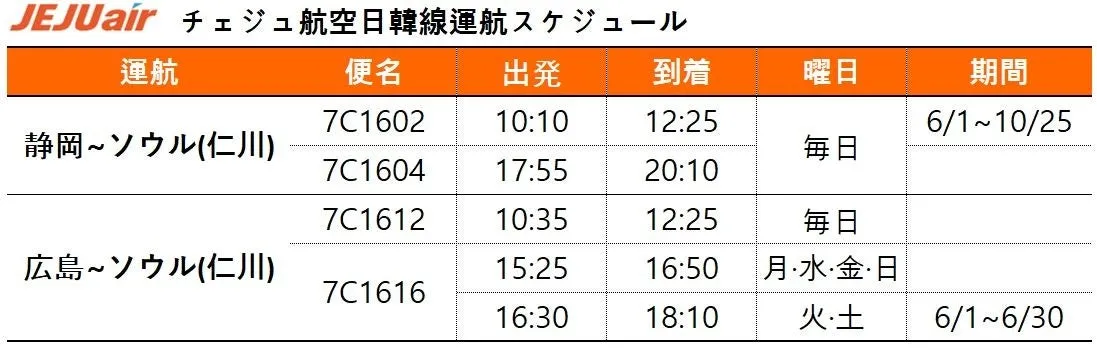韓国の格安航空会社、チェジュ航空は、2024年6月より静岡・広島からソウル(仁川)への便を増やすことを発表しました。これにより、両路線とも旅行者にとっての利便性が大きく向上します。