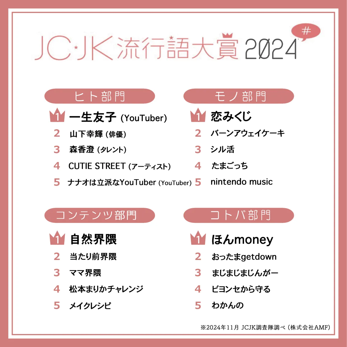2024年7月から11月までのトレンドをまとめた「JC・JK流行語大賞2024」がついに発表された。主催は株式会社AMFで、全国の女子中高生からなるマーケティング集団「JC・JK調査隊」が選考に関わった。この賞は、Z世代向けのトレンドを反映しており、今回から新設された「コンテンツ部門」が話題となっている。