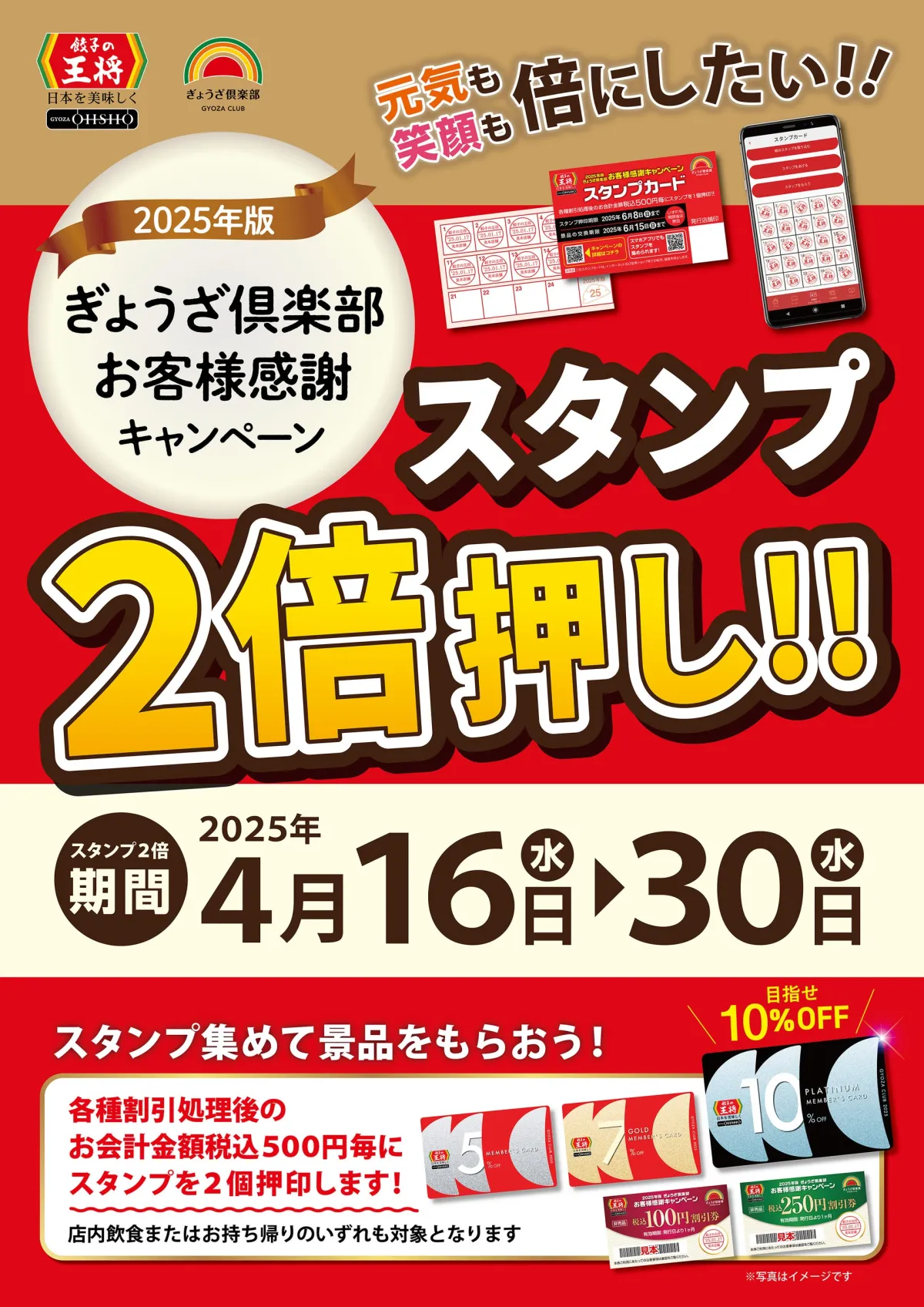 「ぎょうざ倶楽部」会員カードを持っていると、毎回最大10%の割引を受けることができます。この度、4月16日(水)から4月30日(水)までの期間限定で、「スタンプ2倍押し!!」キャンペーンが実施されます。通常、税込500円毎にスタンプが1個押印されるところ、今期間中は2個押印されるため、より早くスタンプを集めることができます。