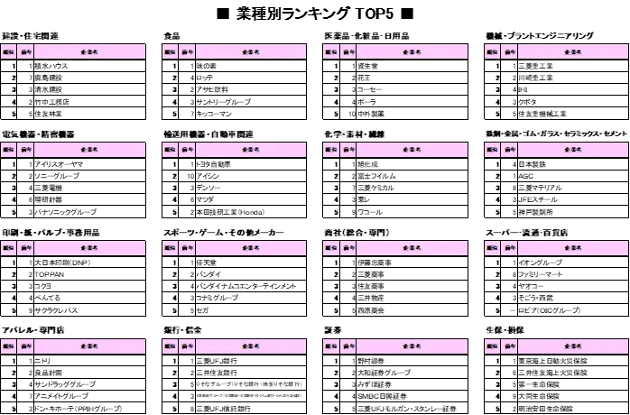 旅行・ホテル・冠婚葬祭のセクターでは特に動きがありました。前年までトップだった星野リゾート・マネジメントが順位を下げ、JTBグループとの順位が入れ替わっています。このように旅行業界は変動が激しく、消費者の嗜好やトレンドにより左右されることが明らかになりました。