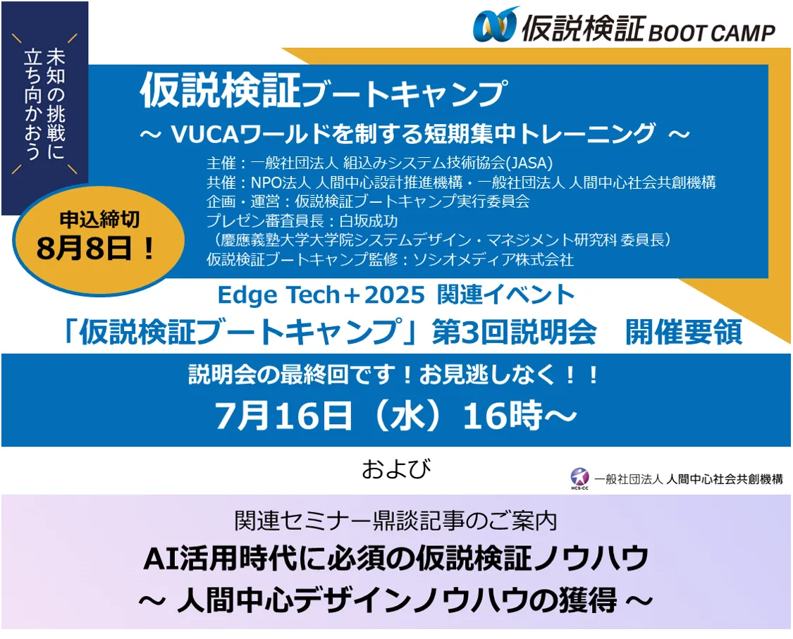 「仮説検証ブートキャンプ」は、参加者が自らの仮説を立て、それを検証することで新しい価値を創出するためのスキルを養うための集中プログラムです。特に、デザイナーやエンジニア、企画職など、さまざまな職種の方々が対象となるこのブートキャンプは、オンラインで行われる説明会を通じて参加者を募集中です。説明会は、2023年7月16日に開催予定で、興味のある方は参加申し込みが求められています。