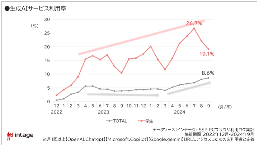 2024年9月の時点で、一般生活者の生成AIサービス利用率は8.6%となりました。この数値は2022年11月にChatGPTが登場して以来、首尾よく上昇していますが、直近1年間は横ばいの状態が続いていました。特に学生の利用率は46.8%と、全体に比べて高い水準を維持しており、学業において生成AIを活用する傾向が顕著であることがわかりました。特にテストやレポートが求められる時期には利用率が上昇し、逆に長期休暇の時期に利用が減る傾向にあります。