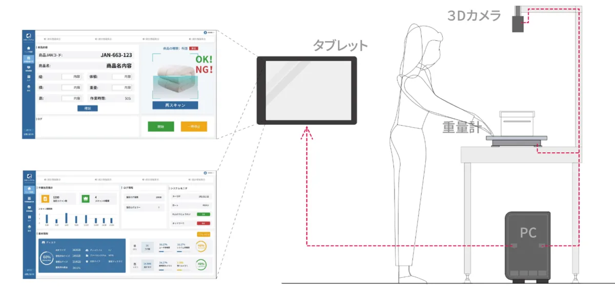 シンプルDWSは、「3Dカメラ、重量計、PC、タブレット、そして現場にある検品台様々な機器がまとめて導入できる低コストなソリューションです。ハードウェアは推奨された機種があり、既に持っている機材を最大限に活用することができるため、企業の状況に応じたフレキシブルな導入が可能です。