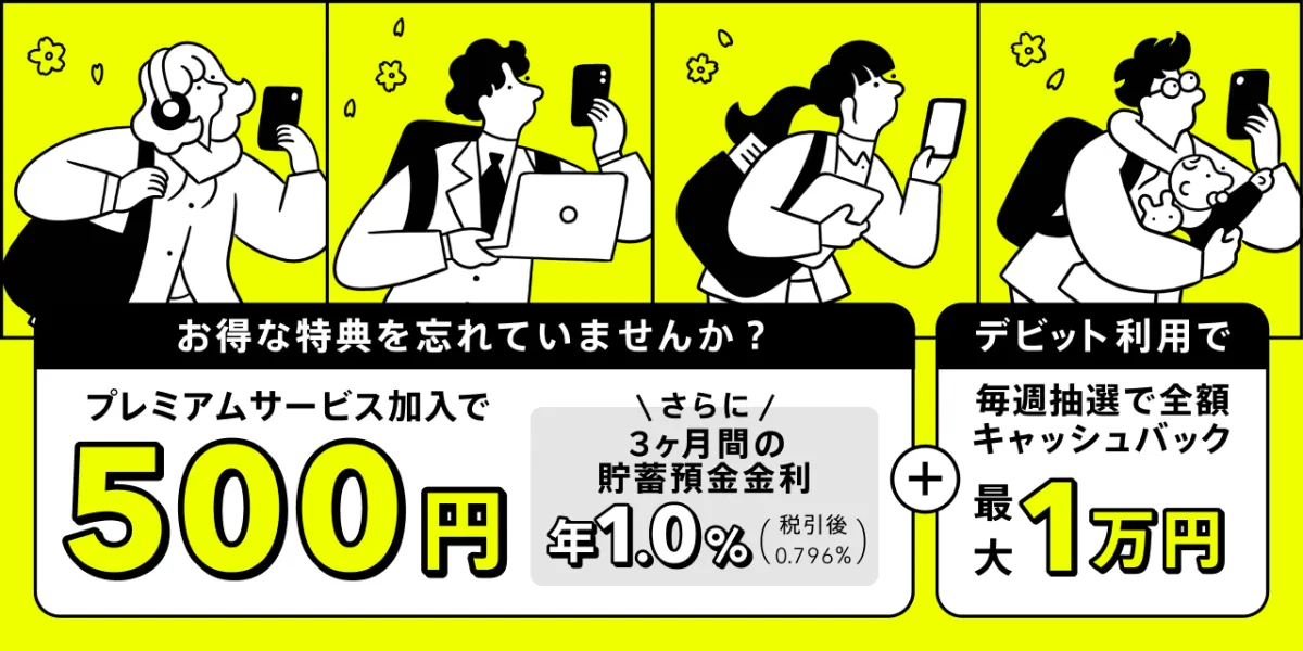 さらに、初めて口座を開設した方には、半年間無料で利用できるプレミアムサービスに申し込むことで、追加で500円をプレゼント。プレミアムサービスは、貯蓄預金金利が年1.0%(税引後0.796%)が適用される特権もあるので、預金を増やしたい方にも最適です。