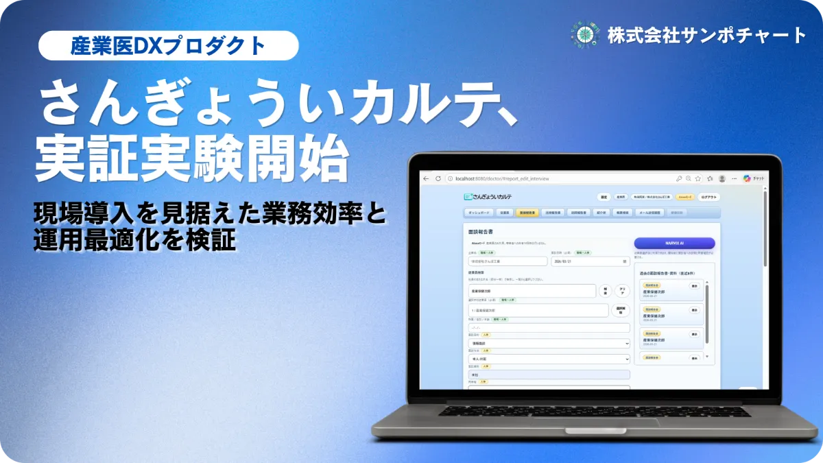株式会社サンポチャート(以下、サンポチャート)が新たに開発した産業医向けデジタルトランスフォーメーション(DX)プロダクト「さんぎょういカルテ」の実証実験がスタートしました。本プロダクトは、産業医業務に関わる面談記録や意見書の作成、情報共有などのプロセスを一元化し、効率化を図ることを目的としています。