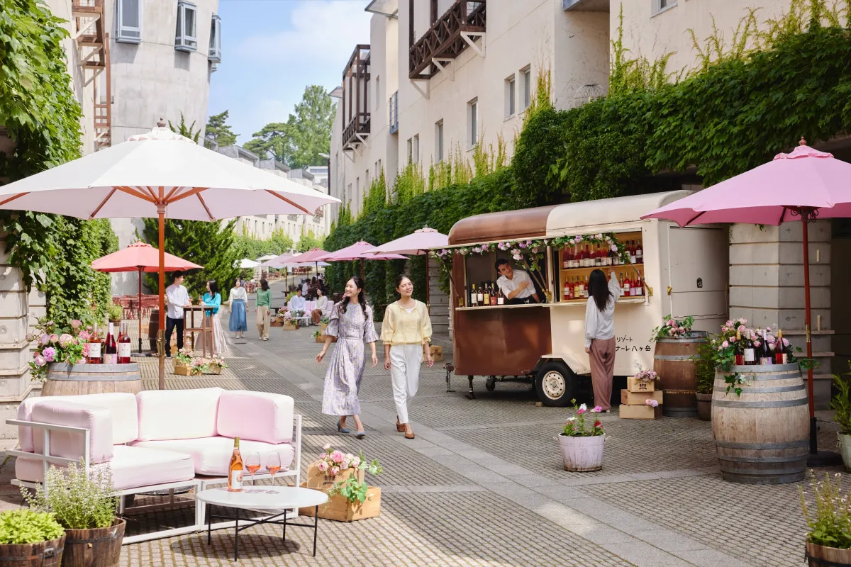 今年のイベントは、リゾナーレ八ヶ岳のメインストリートである「ピーマン通り」がロゼワインの色調をテーマに装飾されます。カラフルなパラソルや心地よいソファが登場し、訪れる人々はこの特別な空間で自由な時間を満喫できます。豊富な色調のロゼワインをイメージした装飾は、春の暖かさを感じさせ、心を弾ませる要素が満載です。