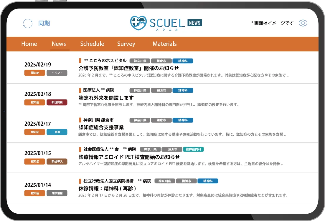 SCUEL NEWSは、医療機関と自治体が公式に発信する様々な情報を収集します。その一部には次のような情報が含まれます:
