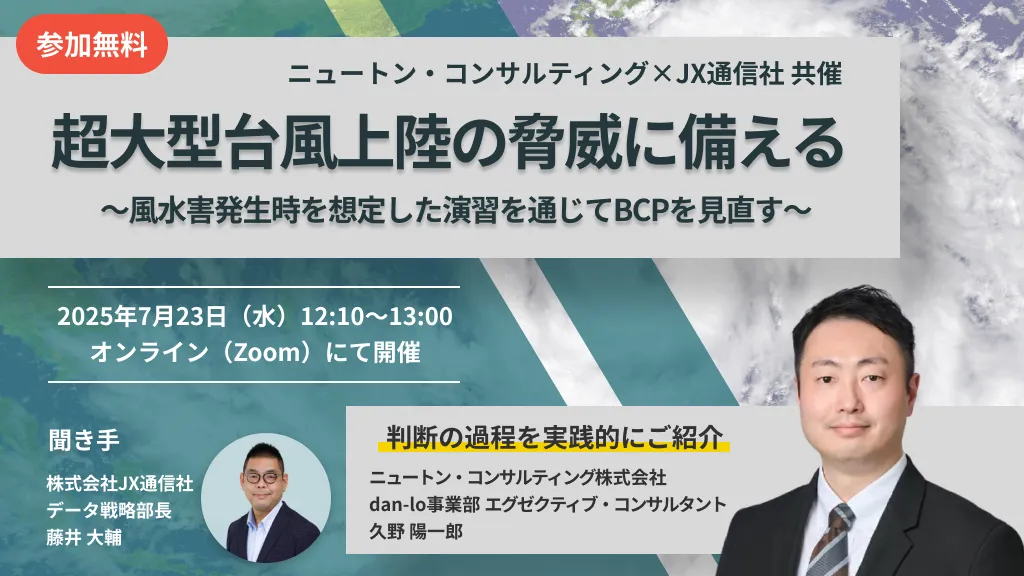 2023年7月23日に、リスクマネジメントコンサルティングを提供しているニュートン・コンサルティング株式会社が、株式会社JX通信社と共催する無料ウェビナーが開催されます。このセミナーでは、超大型台風の上陸に備えた風水害をテーマにした内容が展開されます。