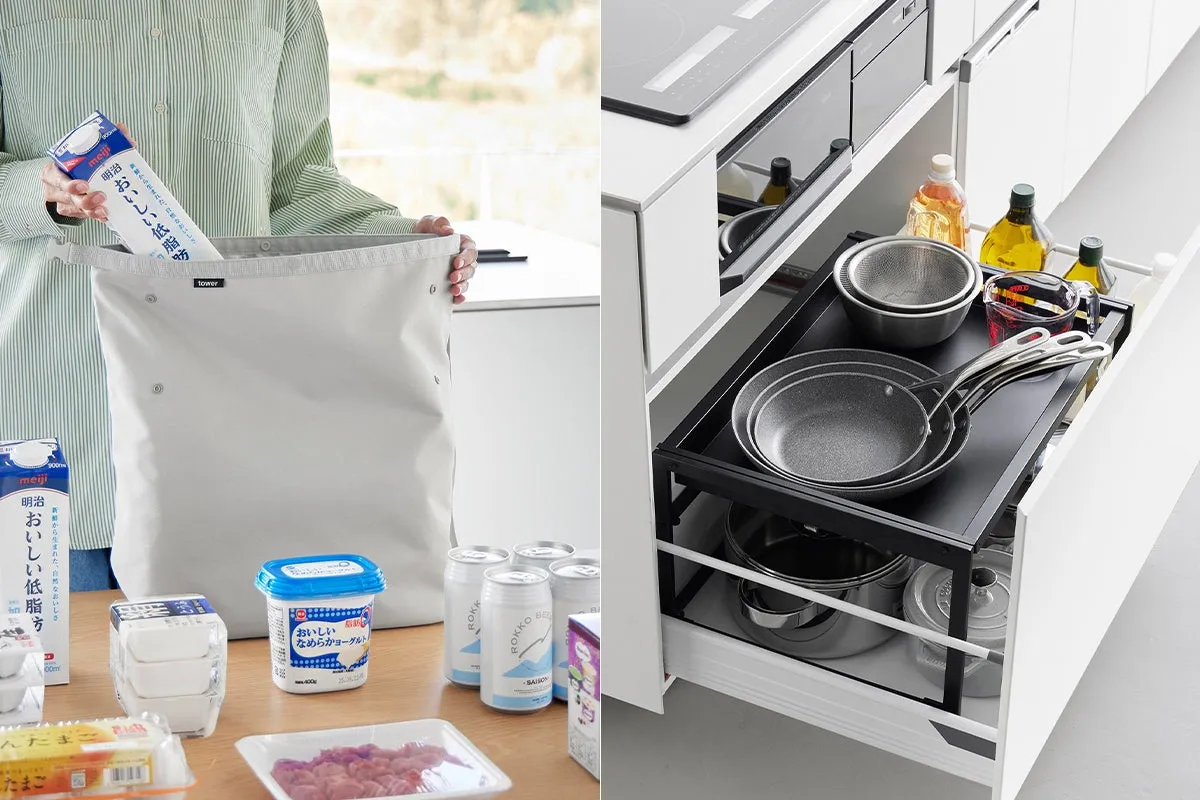 さらに、シンク下の引き出しに設置する「幅伸縮スライドラック タワー D30」とD40もおすすめです。これらのラックは、奥行き30cmまたは40cmで、デッドスペースを有効に活用できる設計になっています。ラックは横幅58.8cmから90cmまで伸縮可能で、設置場所に合わせた調整が可能です。さらに、天板は片手で簡単にスライドできるため、中に収納したものをスムーズに取り出すこともできます。