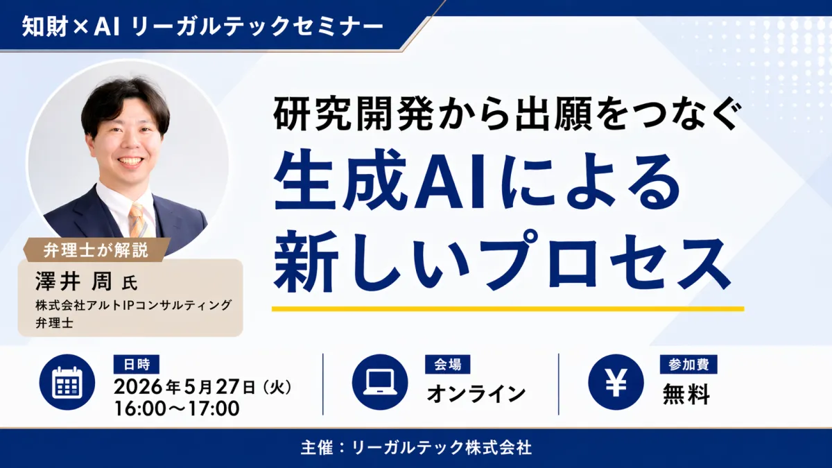 そこで、リーガルテック株式会社が主催するオンラインセミナーでは、生成AIの活用をテーマに、特許業務の新しいプロセスを提案します。