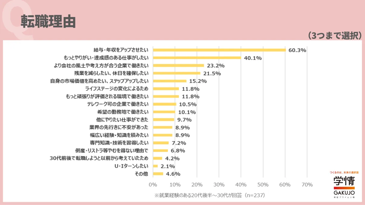 最近の調査データによれば、若い世代の転職理由には顕著な傾向が見られます。株式会社学情が実施したアンケートによれば、20代後半から30代の社会人を対象にした際、最も多かった転職理由は「給与・年収をアップさせたい」というもので、これが60.3%を占めました。従い、以前の世代に比べ、若い世代の働き方への意識が明確に変わってきていることを示しています。