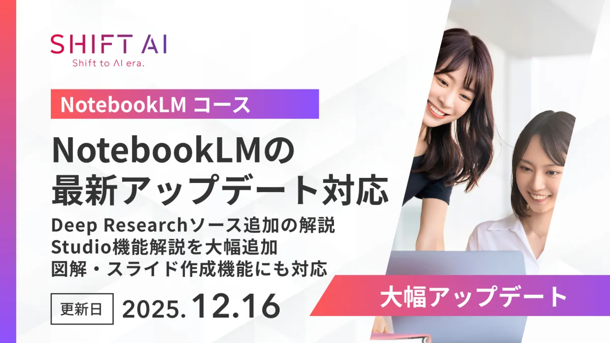 株式会社SHIFT AIが運営する法人向けリスキリングサービス「SHIFT AI for Biz」は、2025年12月16日に大幅にアップデートされた「NotebookLMコース」を発表しました。このコースは、Googleの最新AIノートブック「NotebookLM」に基づいており、特に注目されるのがNano Banana Pro(Gemini 3 Pro Image)との統合による新機能です。