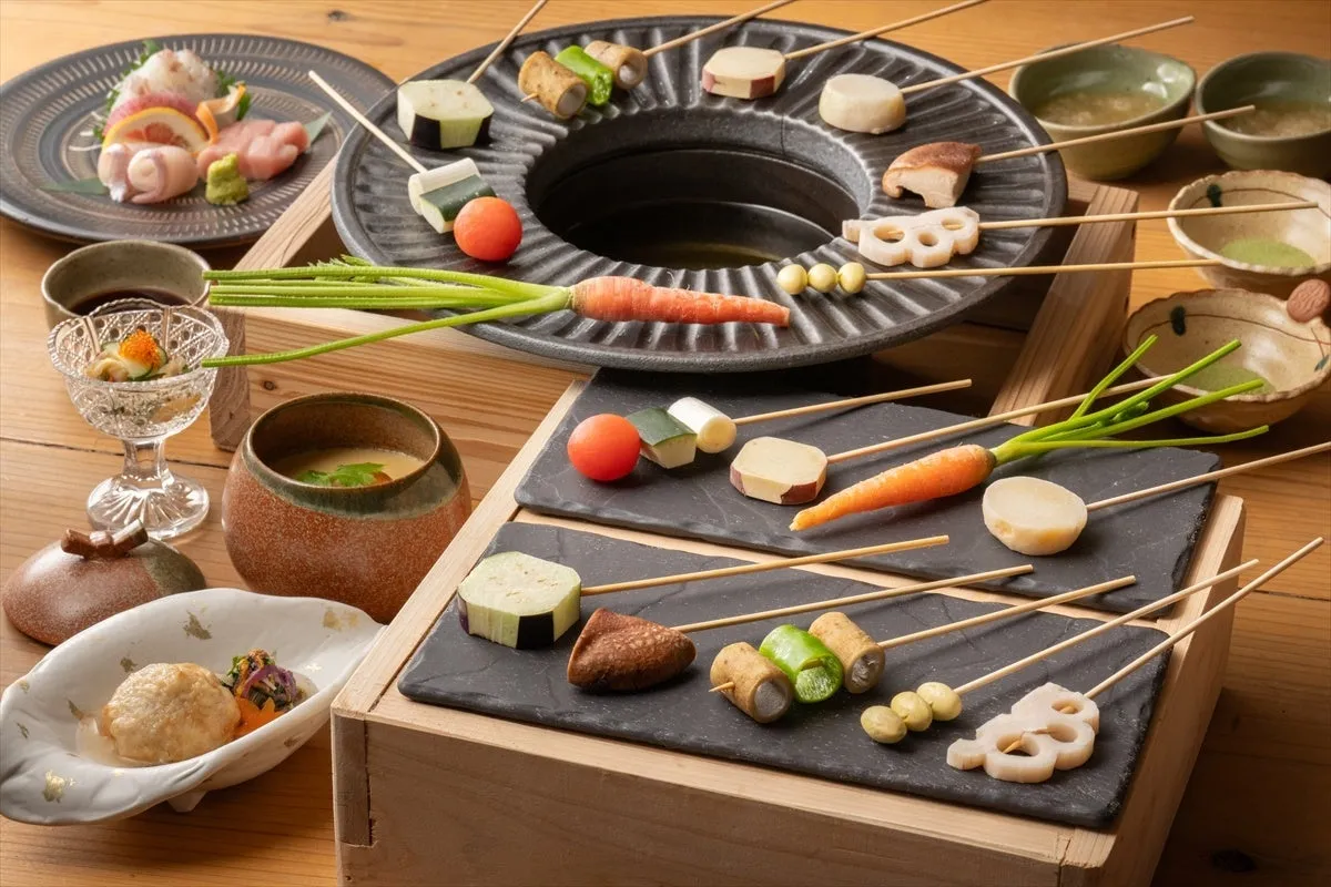 「里山の旬菜 菜種揚げ」は、自分のタイミングで旬の地元野菜を揚げることができる体験型メニューです。揚げる音や香り、衣が色づく瞬間まで、すべてが五感を刺激します。耳に残る「パチパチ」という揚げる音は、静寂な客室に響き渡り、食欲を引き立てるとも言われています。