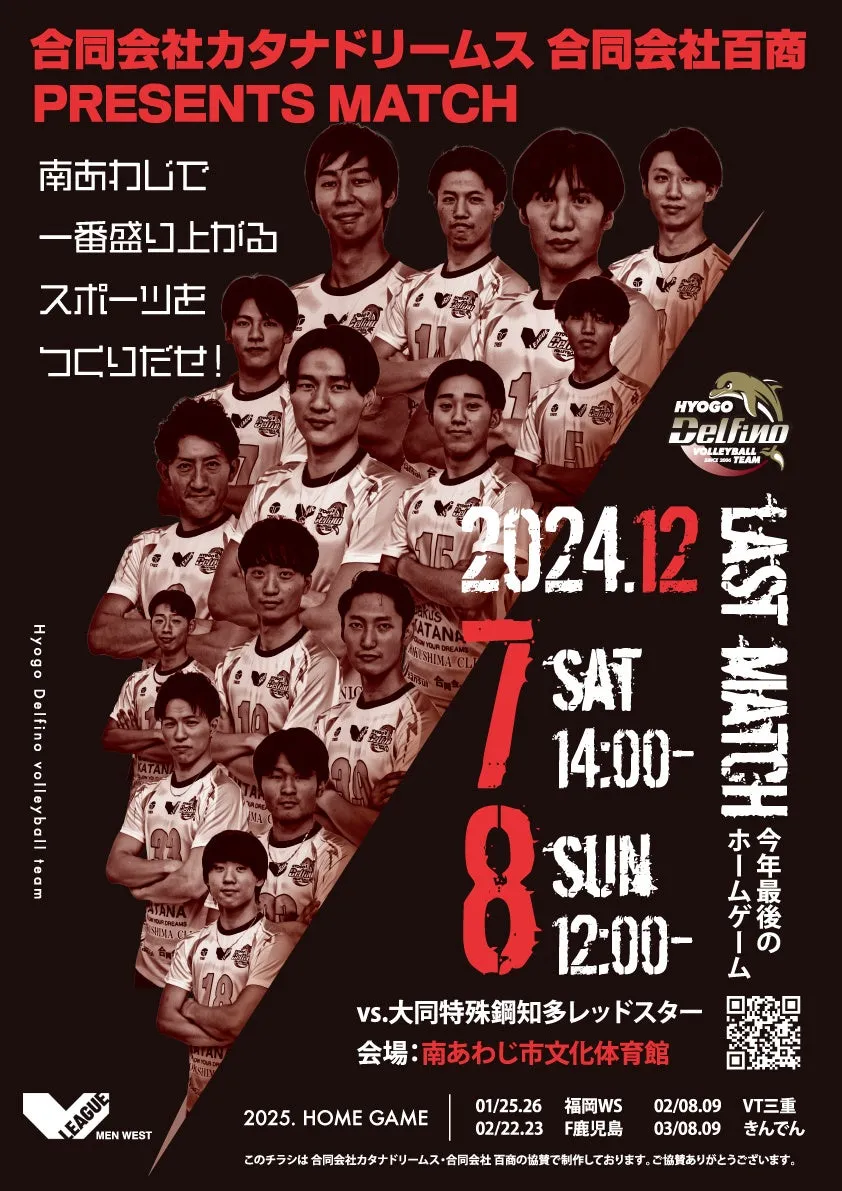 年内最後のホームゲームは、試合自体の楽しさだけでなく、ファンの皆様と選手の距離を縮める数々のイベントが盛り込まれています。観戦するだけではなく、一緒に楽しんで、応援し合いましょう。兵庫デルフィーノの2024-25シーズンに向けた取り組みもご期待ください。皆様のご来場を心よりお待ちしております。