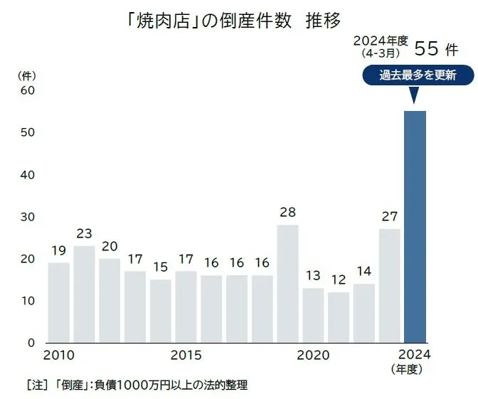 昨今、焼肉店の経営が厳しさを増しています。株式会社帝国データバンクが発表した調査によると、2024年度には焼肉業者の倒産が55件に達し、前年度から倍増、さらに過去最多の記録を更新しました。これにより、多くの焼肉店が市場から姿を消す事態が懸念されています。