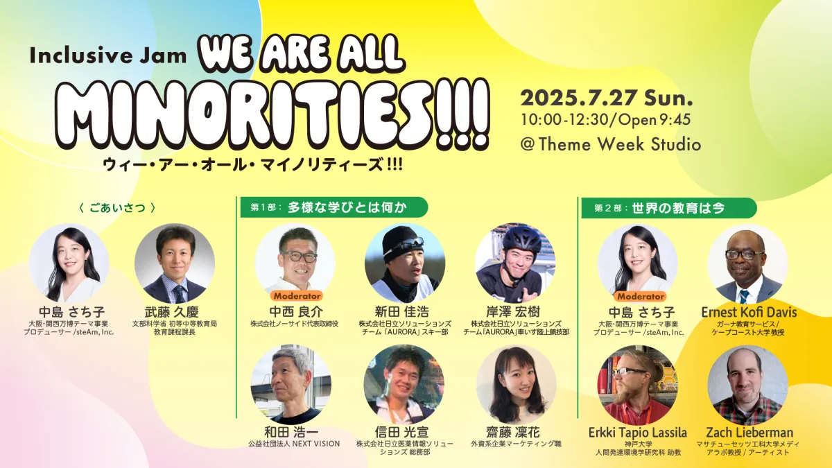 2025年7月27日(日)、大阪・関西万博のテーマウィーク「学びと遊び」に関連したトークイベント「Inclusive JAM “We are ALL MINORITIES!!!”」が開催されます。このイベントでは、多様性をテーマに、さまざまな背景を持つ人々が集まり、誰もが輝ける社会の実現を目指します。
