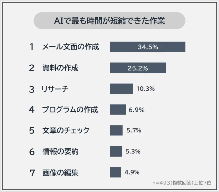 この意識調査は、2025年12月の9日から14日にかけて行われ、493人からの有効回答が得られました。回答者は、30代の人が最も多く、次いで20代、40代と続きます。最も多くの人が感じているAI活用による時間短縮は、実際にどのような作業で実現されているのでしょうか。