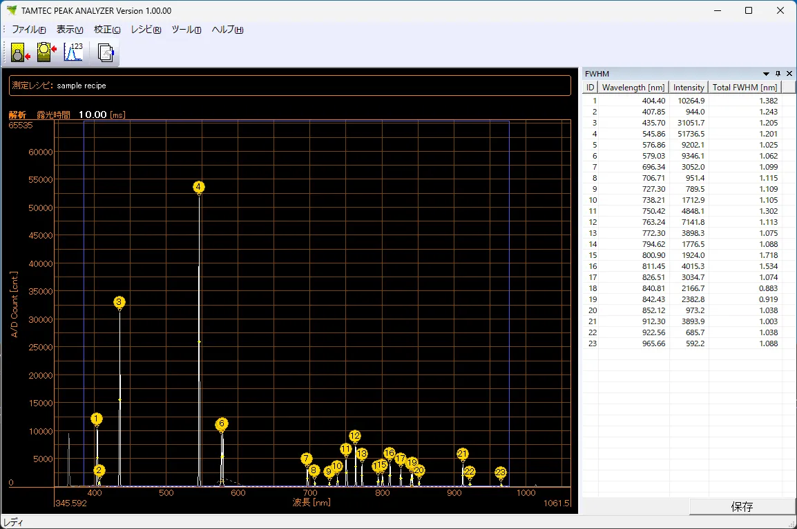 分光計測において、半値幅(FWHM)や複雑なピーク形状の評価は非常に重要です。しかし、従来の分光器付属ソフトウェアでは、必要な機能が不足していたため、多くの利用者がデータをCSV形式でエクスポートし、Excelでの手動計算に頼らざるを得ませんでした。このような非効率な作業が続いている中、「TAMTEC PEAK ANALYZER」は、わずか10万円台から導入できるため、手軽に高機能な解析環境を整えることができるのです。