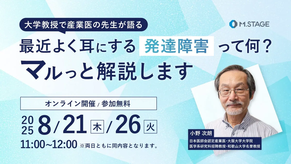 近年、発達障害という言葉を耳にする機会が増えています。しかし、その実態や特性について正しい理解を持つことは意外に難しいものです。そこで、株式会社エムステージは2025年8月21日(木)と26日(火)に、発達障害に関するオンラインウェビナーを開催します。このセミナーでは、大学教授で産業医の小野次朗先生がゲストとして登壇し、発達障害の基本的な理解から、職場でのコミュニケーション改善までを丁寧に解説します。