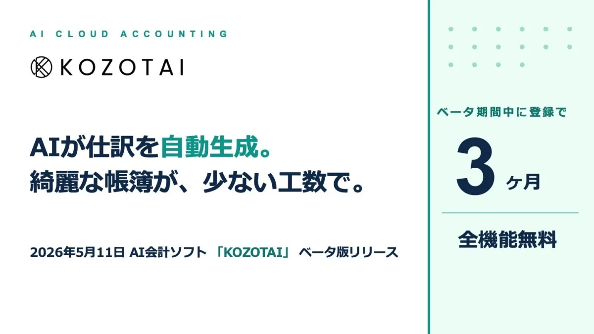 株式会社Kozotaiが、AIを用いたクラウド会計ソフト「KOZOTAI」のベータ版を2026年5月11日にリリースします。この新しい会計ソフトは、企業の経理業務を自動化し、効率を大幅に向上させることを目的としています。また、事前登録を行うことで、特典がもらえるキャンペーンも開始しています。