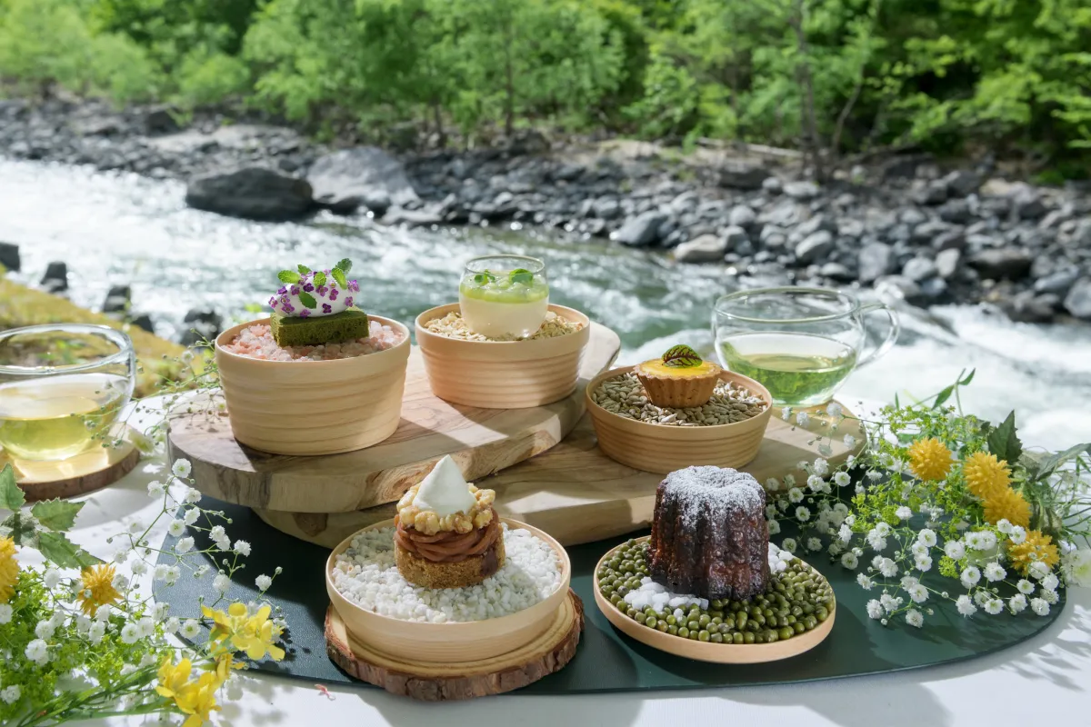 奥入瀬渓流は、四季折々の自然の変化が楽しめる日本でも有数の景勝地です。春になると雪が溶け、新たな芽吹きが始まります。木々の枝先からは新緑が顔を出し、足元にはスプリングエフェメラルと呼ばれる可憐な花々が咲き誇ります。これらの移り変わる景色をアフタヌーンティーで味わう機会を設けました。