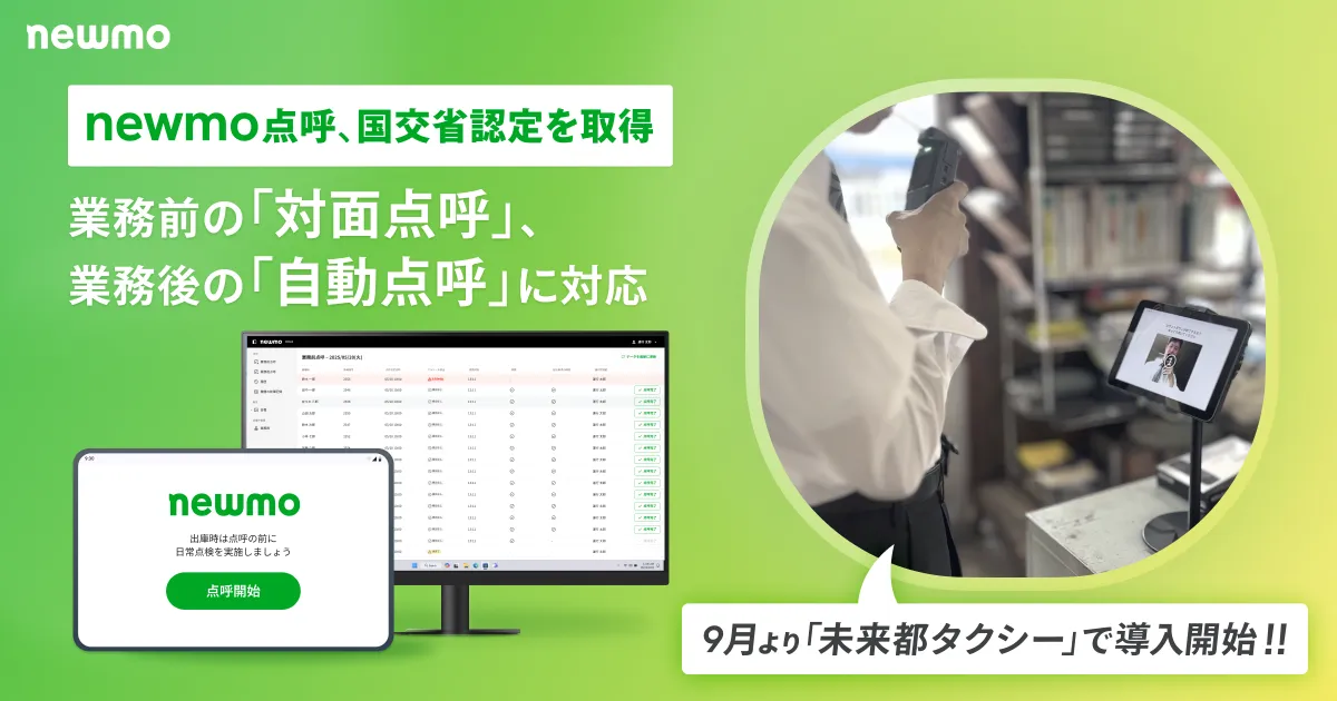 新たに国土交通省の認定を取得した自動点呼機器「newmo点呼」は、タクシー業界における業務の効率化を促進することを目的に開発されました。特に、タクシー業界は法令に基づく始業・終業時の点呼業務が非常に重要でありながら、長年にわたって紙管理や複数システムの併用による非効率な運用が課題となっていました。この点呼機器の導入により、よりスムーズな業務運営が期待されています。