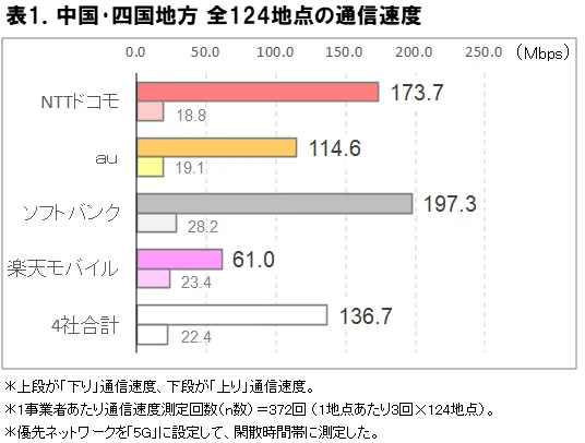 調査の結果、中国・四国地方全124地点の下り通信速度で、ソフトバンクが197.3Mbpsを記録し、他社を圧倒する結果となりました。次いで、NTTドコモの173.7Mbps、auの114.6Mbps、楽天モバイルの61.0Mbpsという順で、四社の平均速度は136.7Mbpsとなりました。興味深いことに、地域別に見ると、広島県、山口県、高知県ではNTTドコモがトップでしたが、他県ではソフトバンクが優位でした。